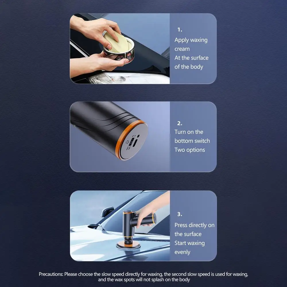 1、【Wireless Waxing】Equipped with cordless waxing with 45min endurance, Buffer Polisher is powered by 2 built-in 2000 mah batteries and lasts longer to meet the waxing needs of large models.